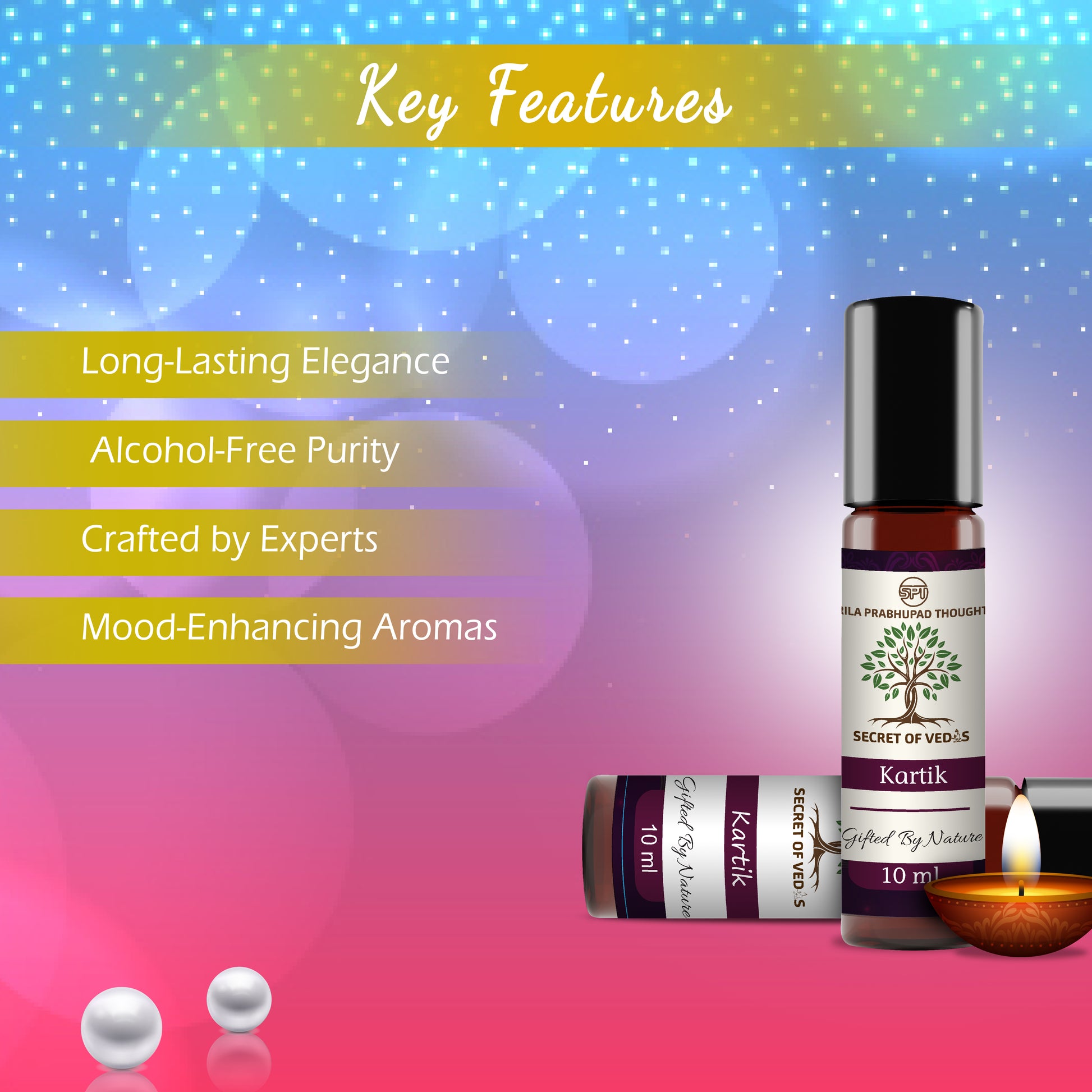 Kartik Attar is a spiritually uplifting attar inspired by Kartik Maas, the sacred month in the Hindu calendar known for purity, devotion, and deep connection to the divine. Crafted from a harmonious blend of natural herbs, sacred flowers, and subtle woody notes, this attar evokes a serene, devotional atmosphere ideal for prayer, meditation, and temple rituals.